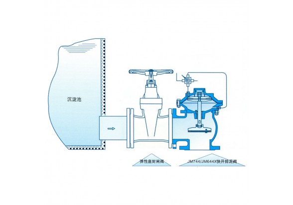 JM644X/JM744X快開排泥閥通常安裝在沉淀池底部外側(cè)壁, 用以排除池底沉淀的泥沙和污物。 該閥由強(qiáng)化尼龍橡膠隔膜將閥門分為上下兩腔, 通過氣動(dòng)源或液壓源作執(zhí)行機(jī)構(gòu), 采用電動(dòng)或手動(dòng)二位四通換向閥控制, 使上下兩腔形成壓差, 從而實(shí)現(xiàn)快速開啟與關(guān)閉,達(dá)到排泥目的。 該閥運(yùn)動(dòng)無摩擦, 適用于泥漿等顆粒介質(zhì)。